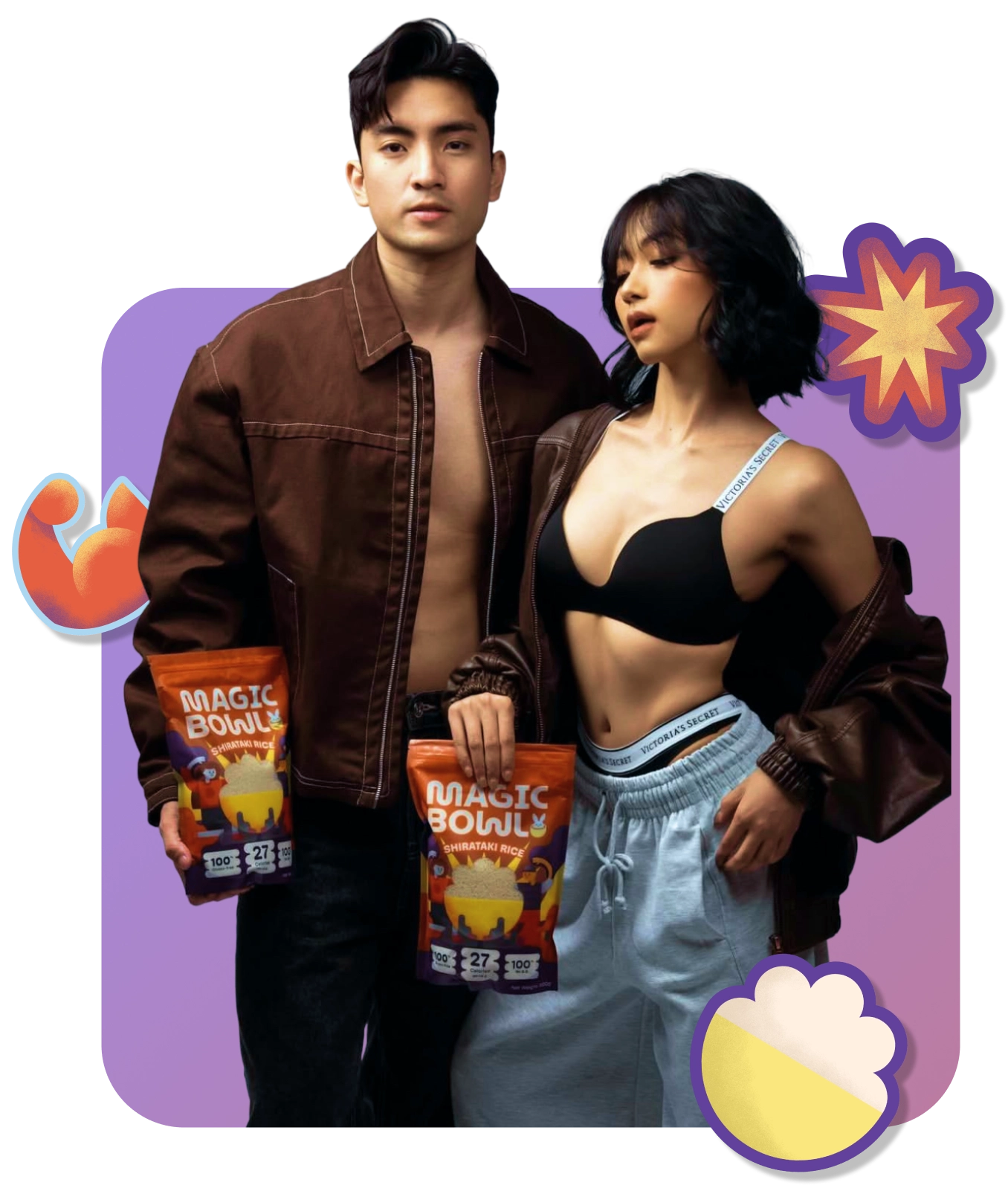 We’re Miguel & Naz 👋 After trying 7 shirataki rice brands that had almost the same calories as white rice, we said “enough.” So we teamed up with food scientists, obsessed for 18 months, and perfected Magic Bowl, a dry shirataki rice with a whopping 41% lower calories than other brands. Finally, a rice upgrade that actually makes sense.