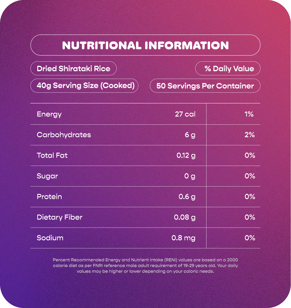 It’s a smarter rice alternative made from konjac root. With only 68 calories per 100g, it has almost half the calories of regular rice while still tasting and feeling like the real thing.